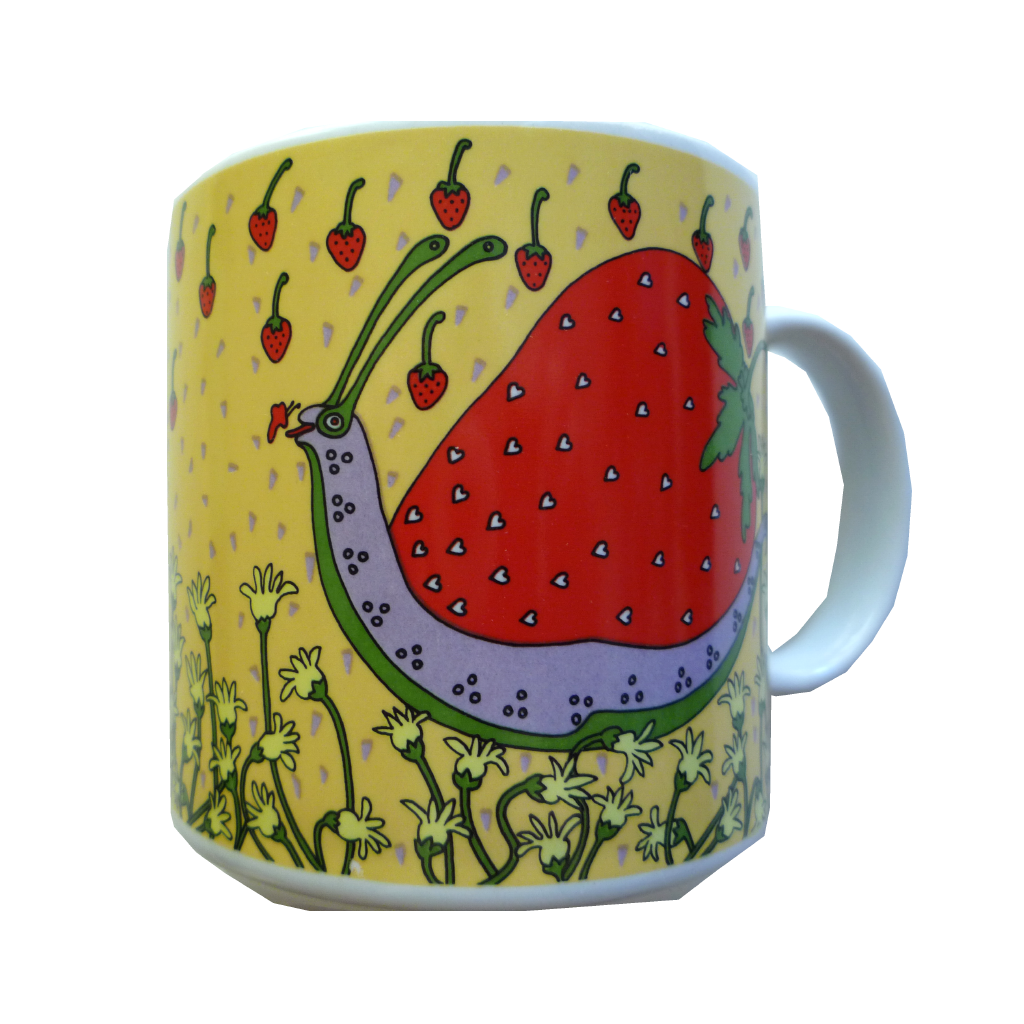 Classy Critter with Strawberry Snail on a white 11oz stackable mug. Dishwasher, microwave safe. Made in China.